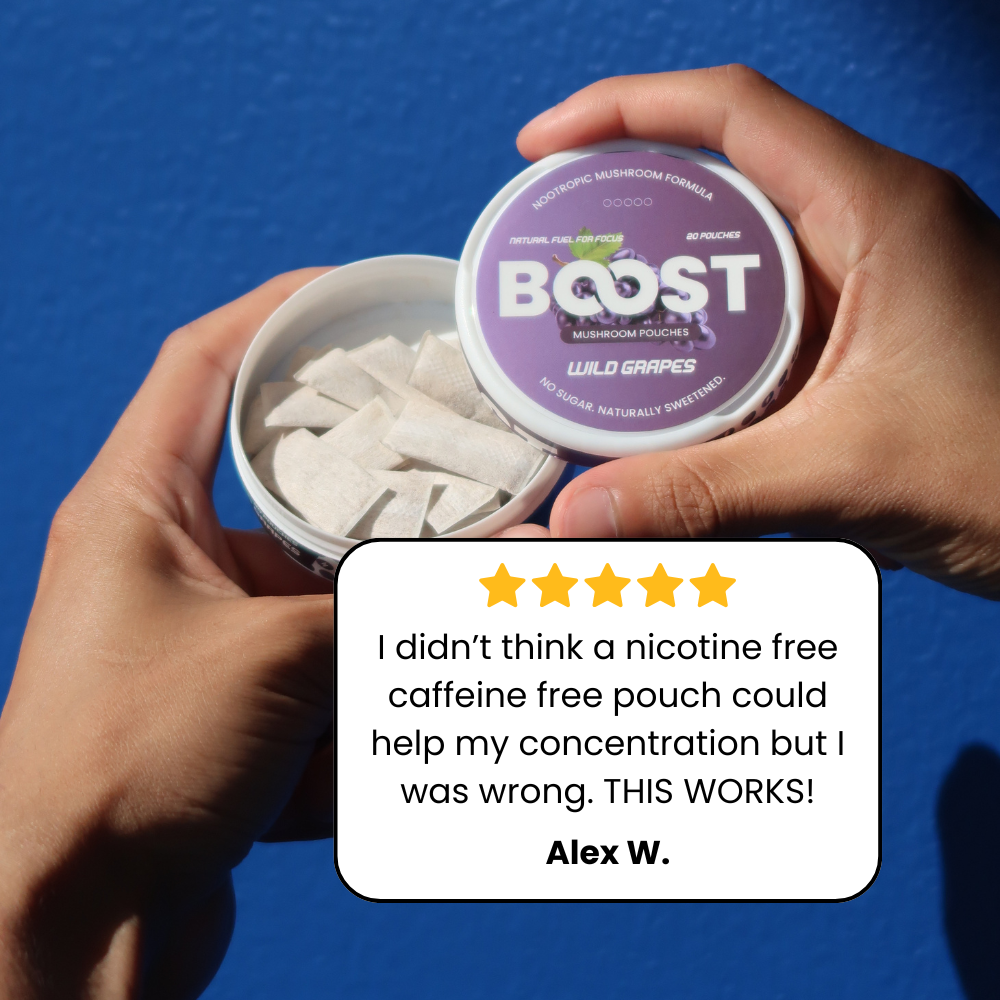 Instead of relying on addictive stimulants for a quick buzz, Boost Pouches give you steady focus powered by natural ingredients like Lion’s Mane, Cordyceps, Reishi, Alpha GPC, And more!